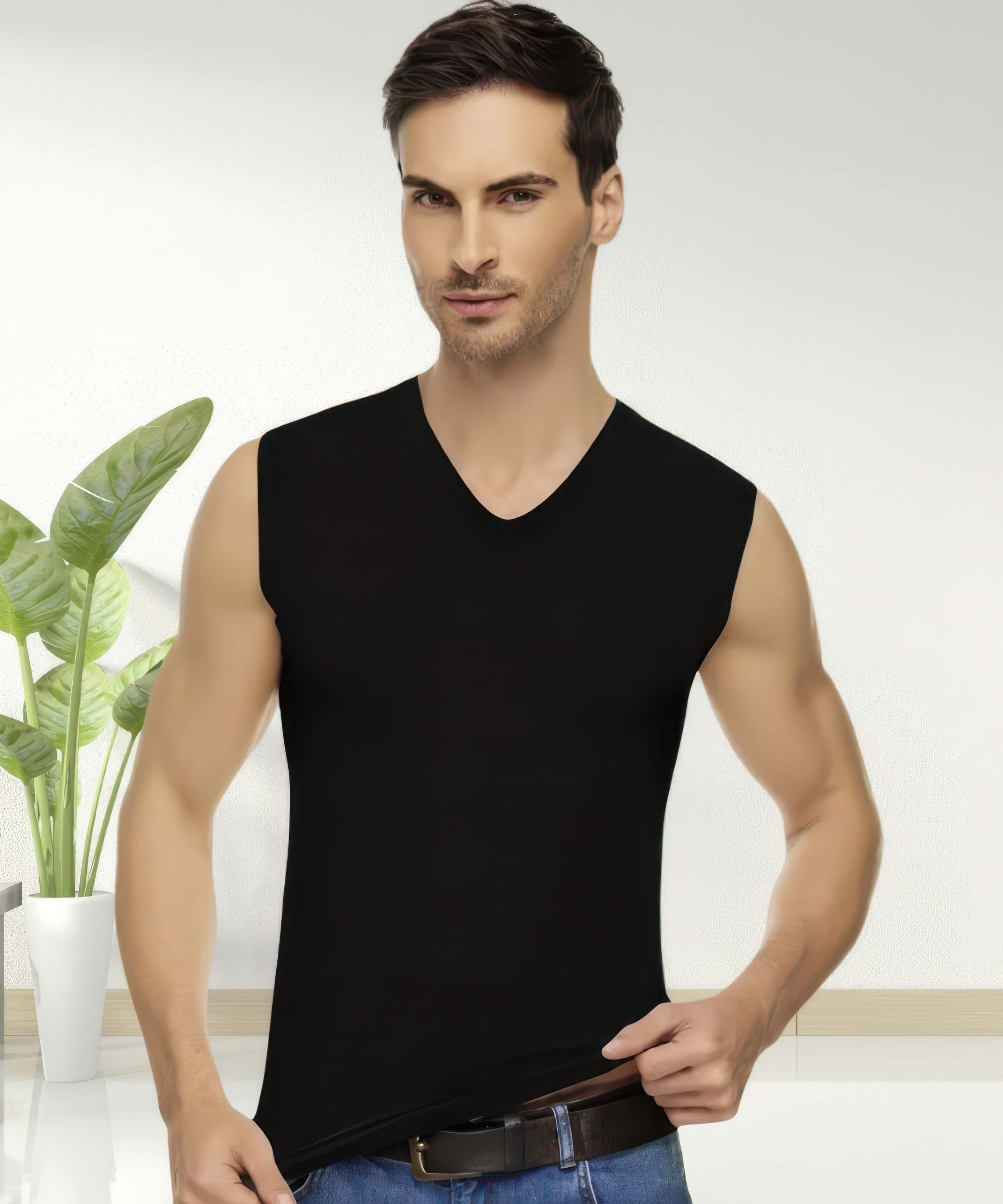 Esnek elestan yapısı ve nefes alan kumaşıyla gün boyu konfor sunan V yaka sıfır kol atlet.